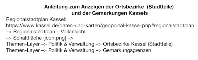 Regionalstadtplan Kassel zeigt für das Gebiet der Stadt Kassel, wie die Grenzen der Ortsbezirke von den Gemarkungsgrenzen abweichen: